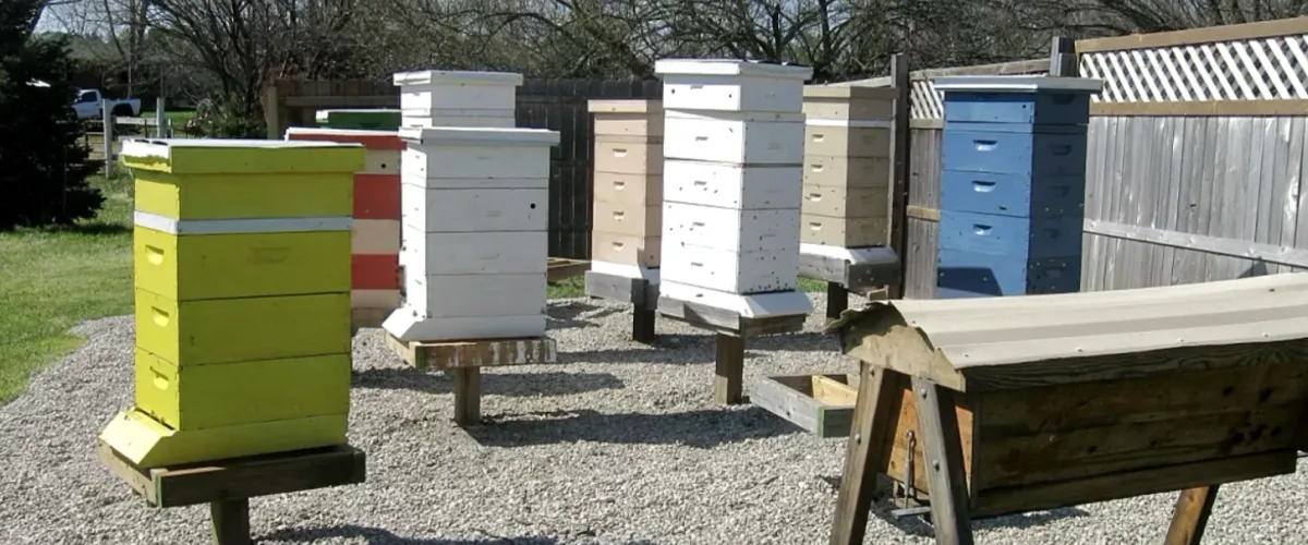 We painted outside of hives with unique designs or colors to protect the wood and reduce drifting by returning bees. We used water-based (latex) exterior paints and untreated lumber for box construction. We do not paint inside the boxes.