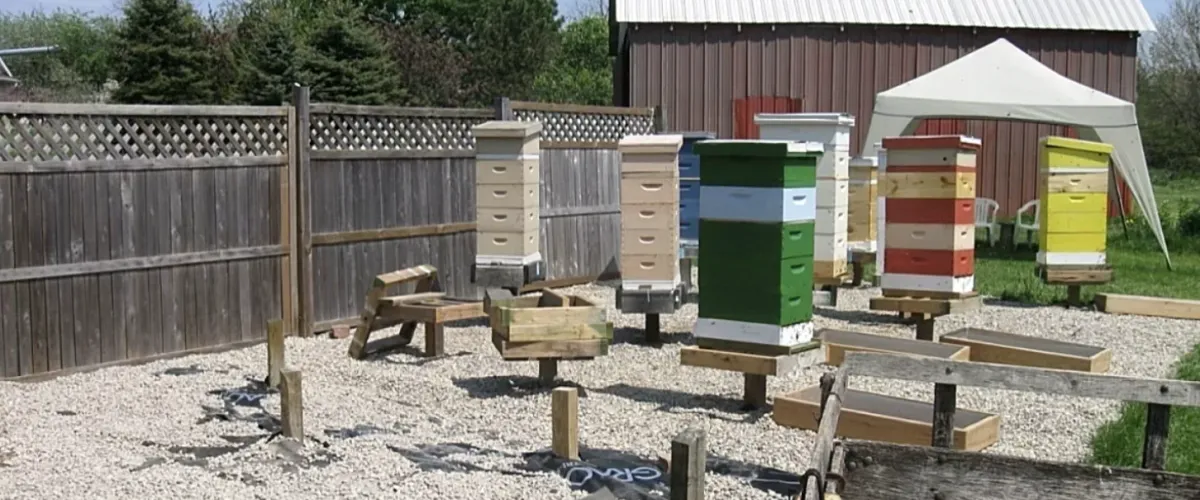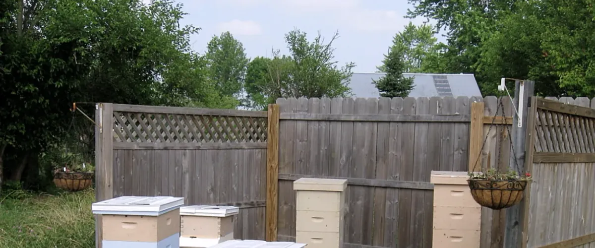 We provided a winter windbreak on the East, North, and West sides of the apiary. Plants, fencing, straw bales, pallets, plywood, buildings, or a natural area will also work. We chose three panels of attractive fencing, but removed the panel on the East side after poor hive performance in the first two years due to excess shade. We have better survival from hives enjoying full sun in the apiary. Consider using attractive fencing to force bees to fly over a neighbor's property, even if ordinances do not require a barrier.