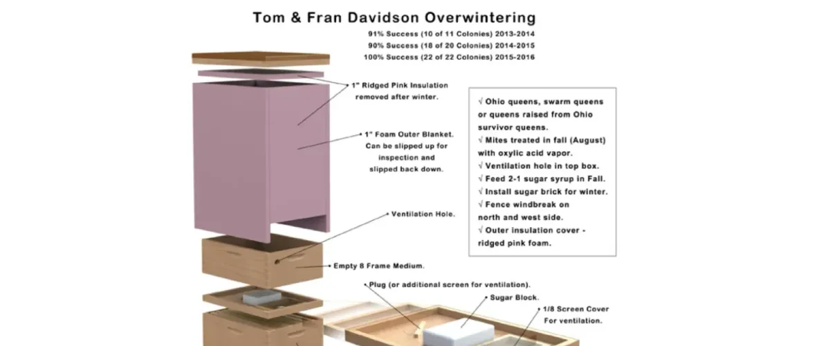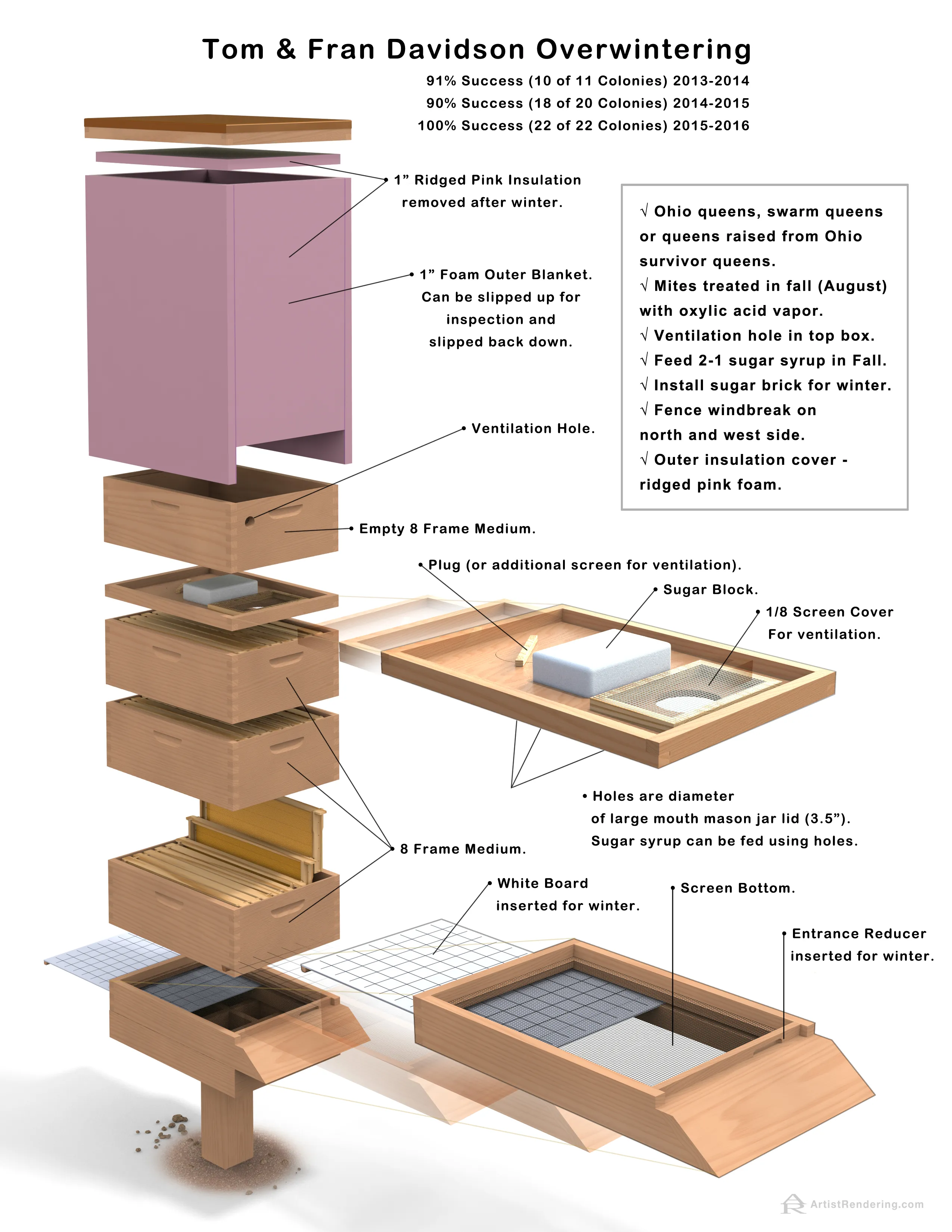 Use of all 8-frame medium Langstroth supers for brood and honey. Modified inner cover expanded. We use the screen bottom board with a whiteboard, which is left inserted over winter.